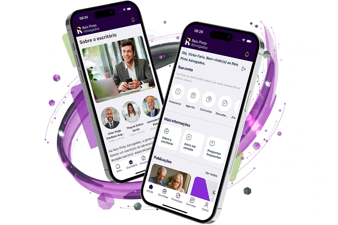 App Reis Pinto (iOS e Android): linha do tempo do processo, anexos e notificações em tempo real.